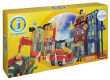 ¡La Ciudad de aventuras Imaginext está cargada de diversión y acción! A la izquierda hay una gasolinera, un banco con un disco que al girarlo abre la cámara acorazada de la pa