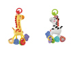 Surtido de dos pequeños peluches (cebra y jirafa) que entretendrán al bebé con sus texturas, colores y sonidos clic-clac. De las patas de los peluches cuelgan una variedad de