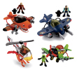 Surtido de cuatrop aviones con hélices giratorias, tren de aterrizaje desplegable y una cabina donde cabe una figura. Incluyen una figura de piloto y casco.